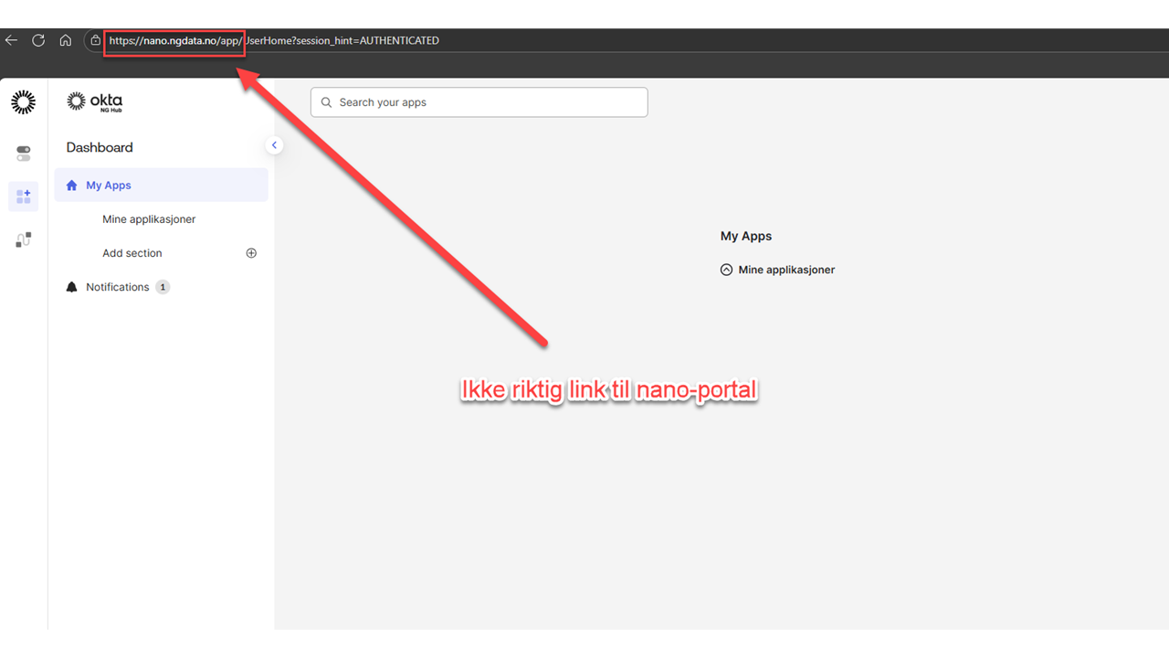 En vanlig årsak til at du ikke mottar Okta Push-varsel, er at Okta Verify er satt opp i feil Nano-portal/miljø. Dette skjer ofte fordi lenkene til Nano-portalene ikke tydelig viser hvilket miljø du befinner deg i, noe som kan gjøre vanskelig å se at du er logget inn på feil sted.